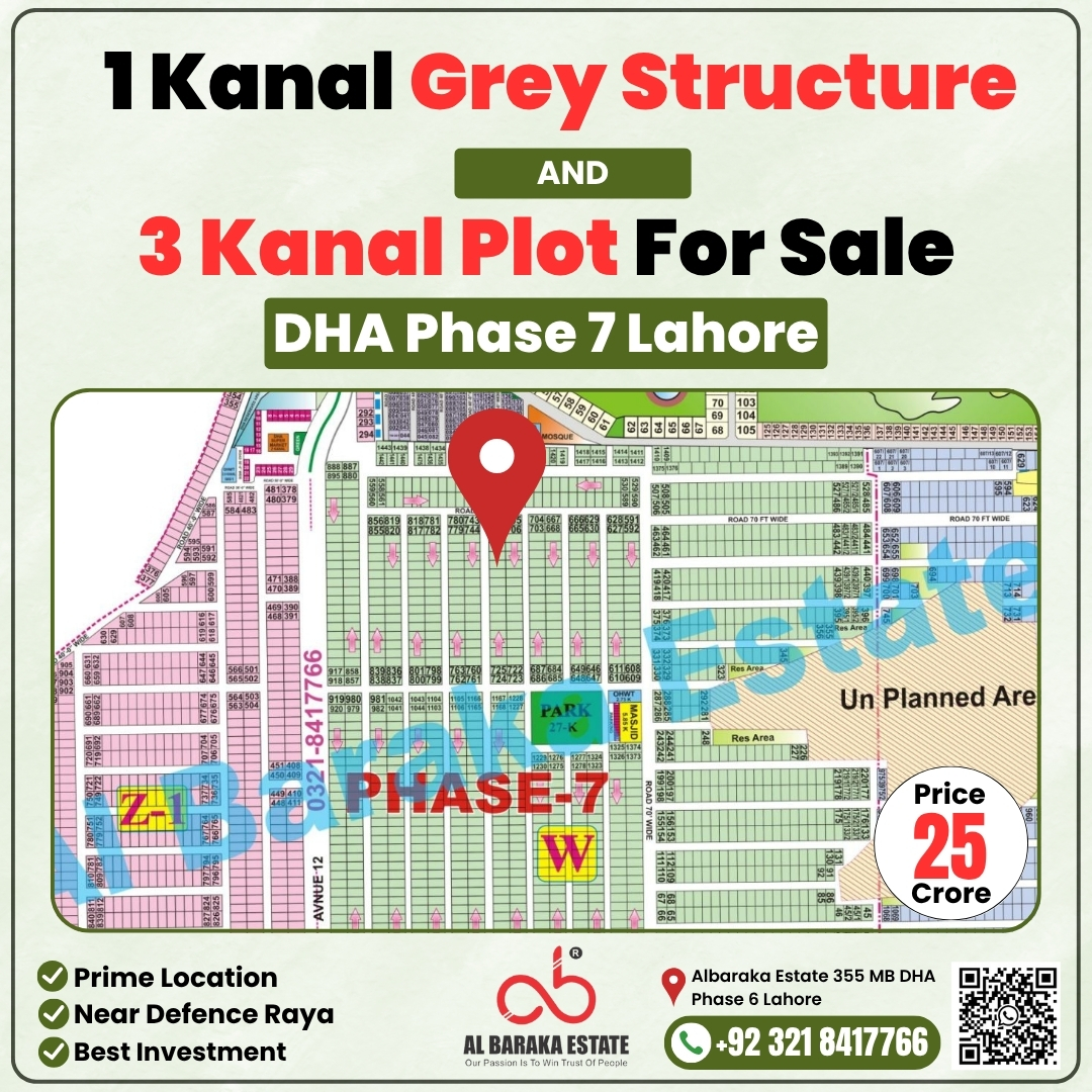 1 Kanal Grey Structure House & 3 Kanal Plots for Sale in DHA Phase 7, Lahore