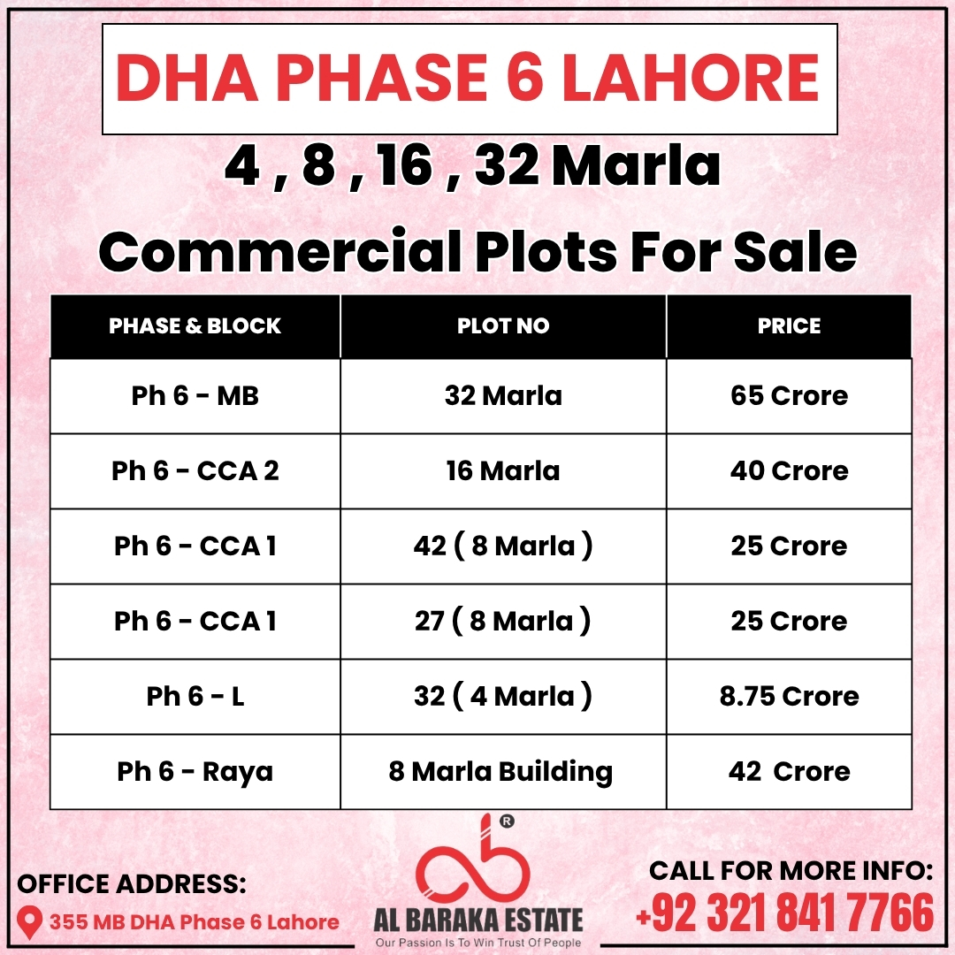 An exceptional opportunity to own prime commercial plots in the heart of DHA Phase 6 Lahore. Perfect for retail outlets, offices, showrooms, or long-term investment in one of Lahoreโ€™s busiest and most prestigious locations.
