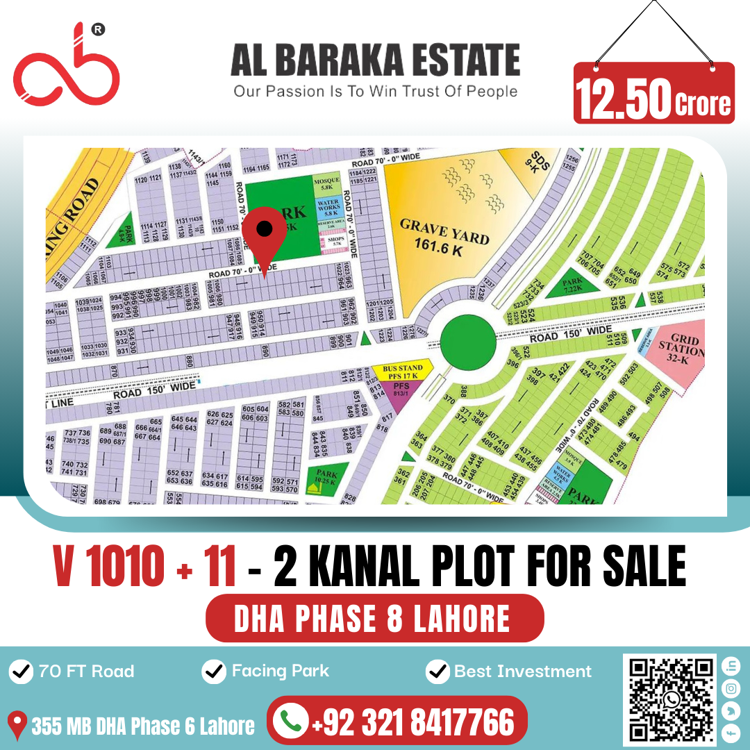 An exclusive opportunity to own a 1 Kanal Pair Plot in the prestigious DHA Phase 8, Lahore. Ideally located facing the park and positioned on a 70 ft wide road, this property offers the perfect blend of luxury living and high investment value. Just 2–3 minutes away from DHA Main Office, Ring Road, and Dolmen Mall, it ensures unmatched accessibility and convenience.