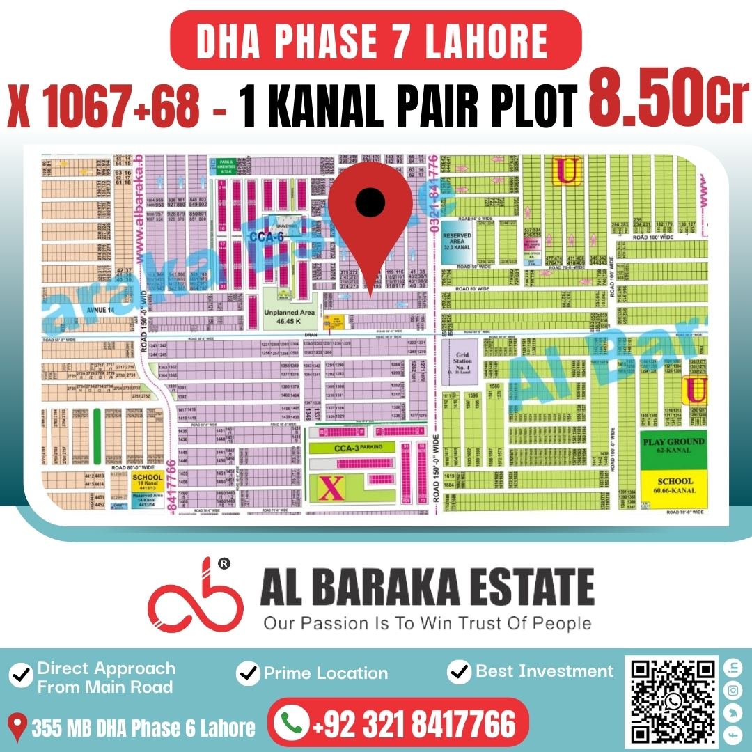 An excellent opportunity to invest in 1 Kanal pair plots located in the highly sought-after DHA Phase 7, Lahore. These plots are positioned in a prime location with direct access from the main road, ensuring both convenience and strong future value.